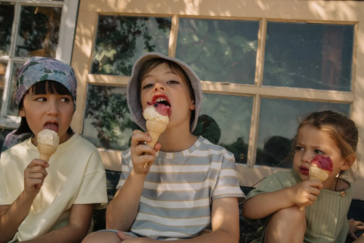 Echoing this joie de vivre, our palette of shades bears the colours of the Mediterranean, with stripes in greek blue, capri green or sienna red, fruity and proud purple, gourmand vanilla yellow... Our prints are inspired by sun-drenched vegetables, tomatoes and courgette flowers, and summer's guilty pleasure: ice cream! For the first time, we're daring to go all over with strawberry prints, a delicate exuberance..